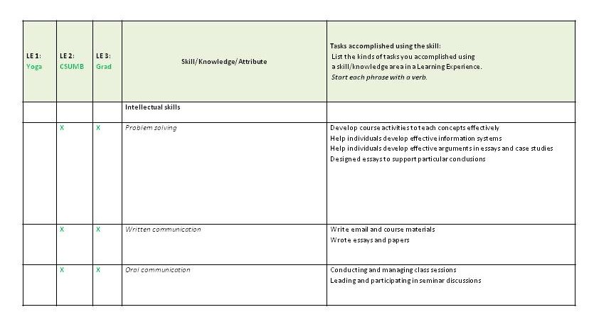 This example illustrates establishing column abbreviations for each of your key learning experiences, LE1, LE2, and LE3, in your Skill-Experience-Action worksheet.